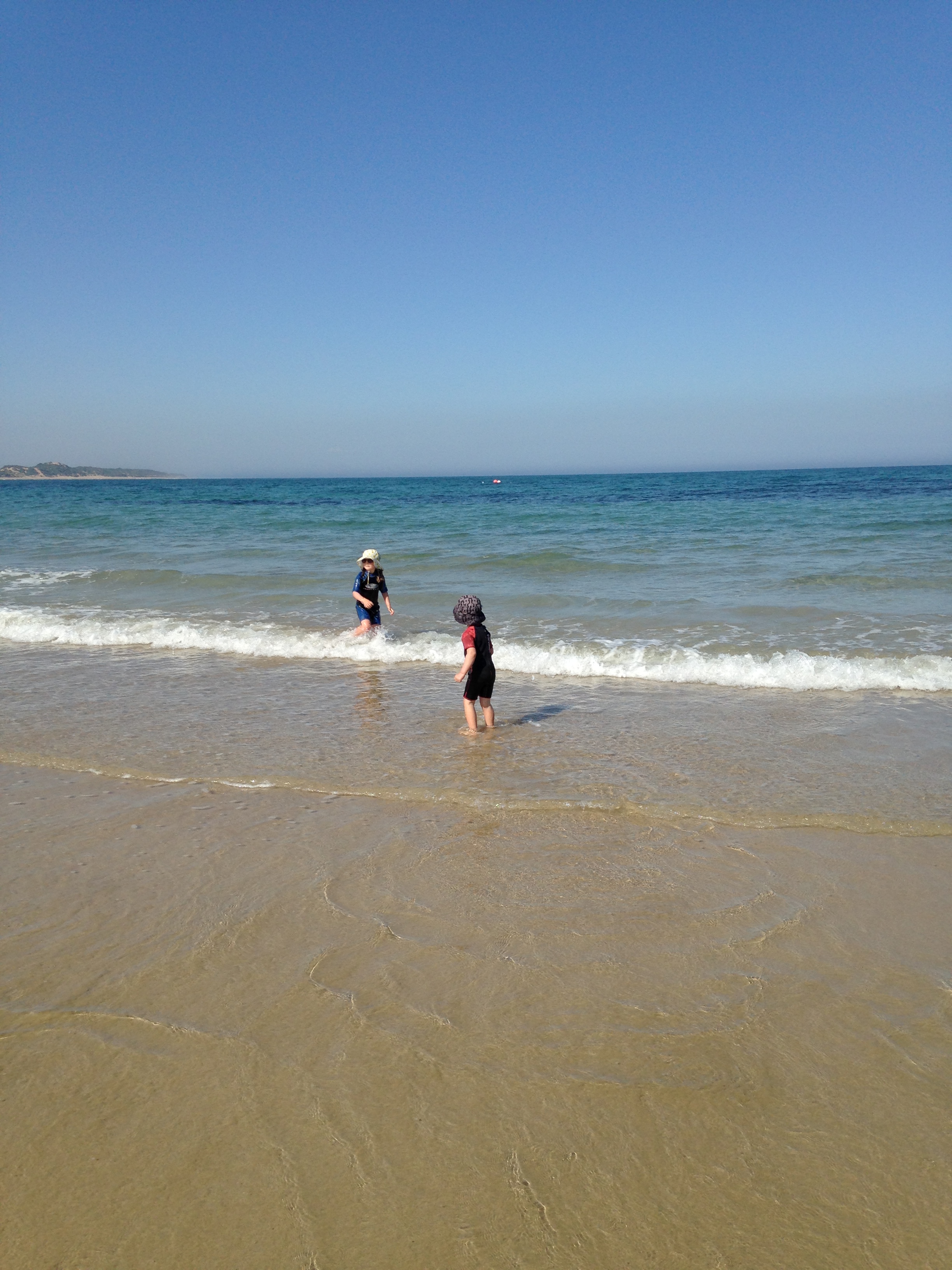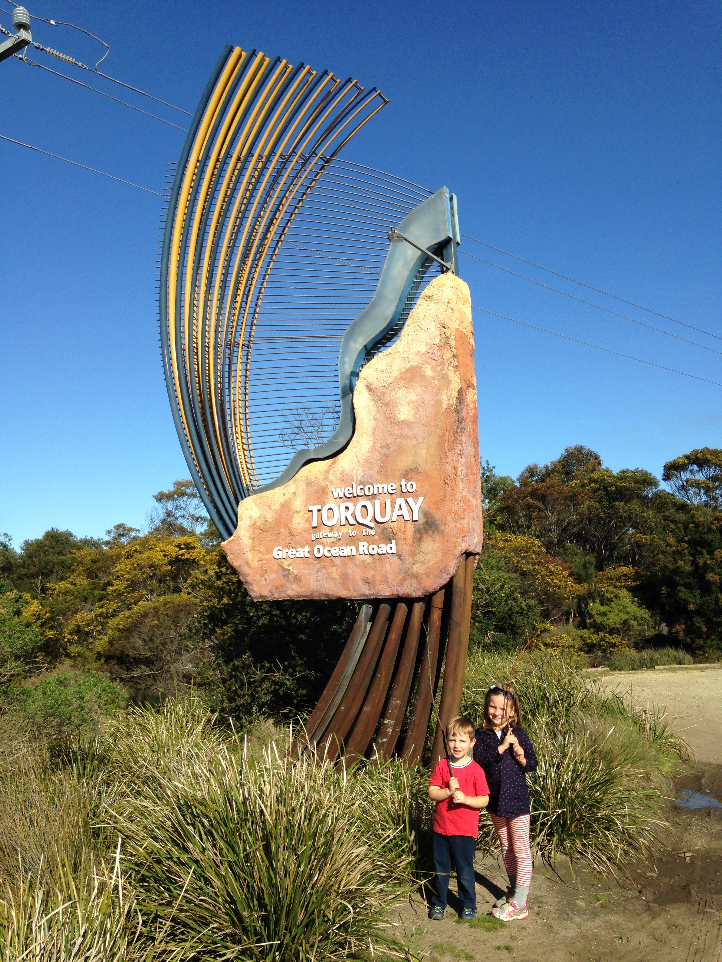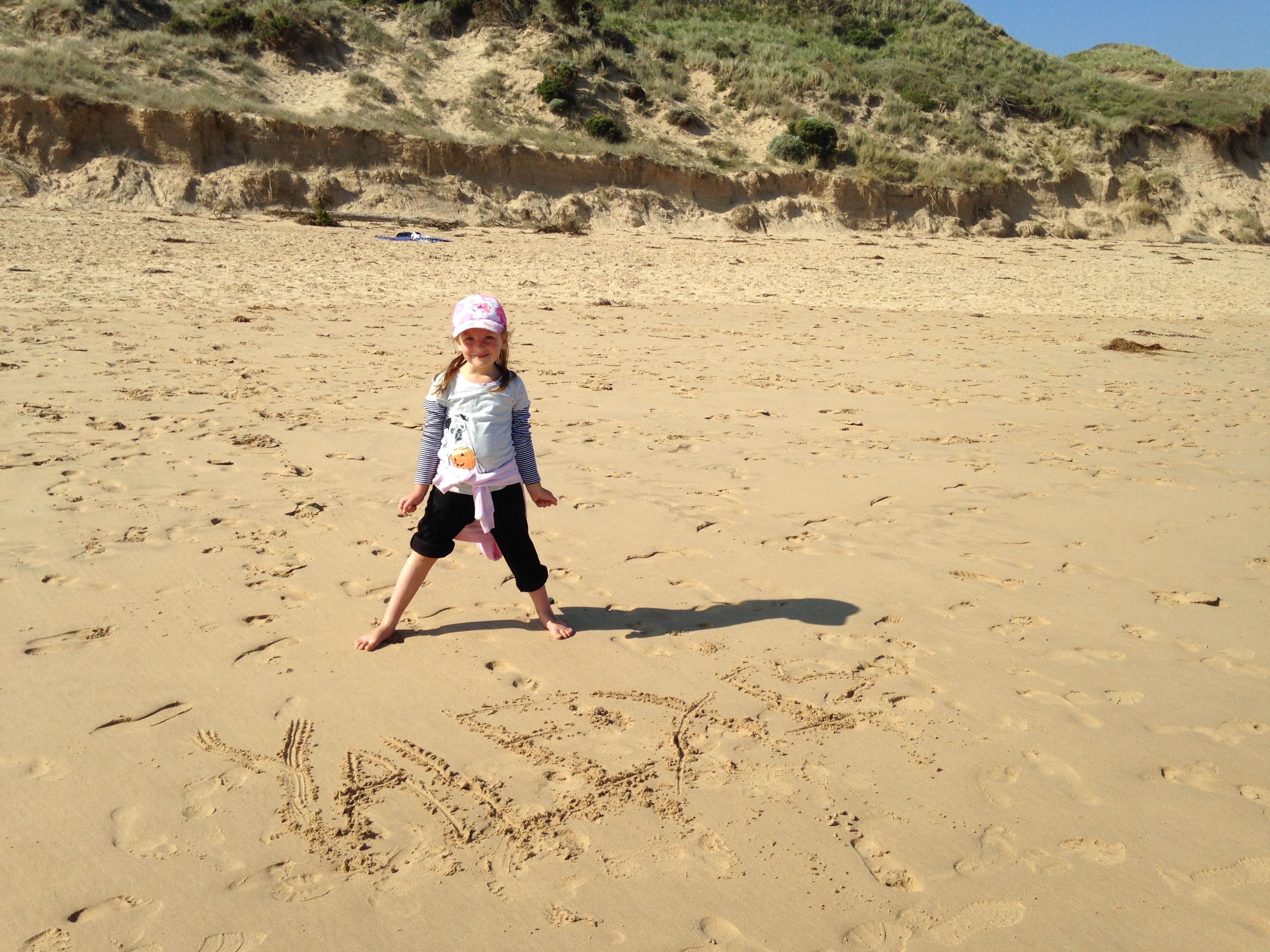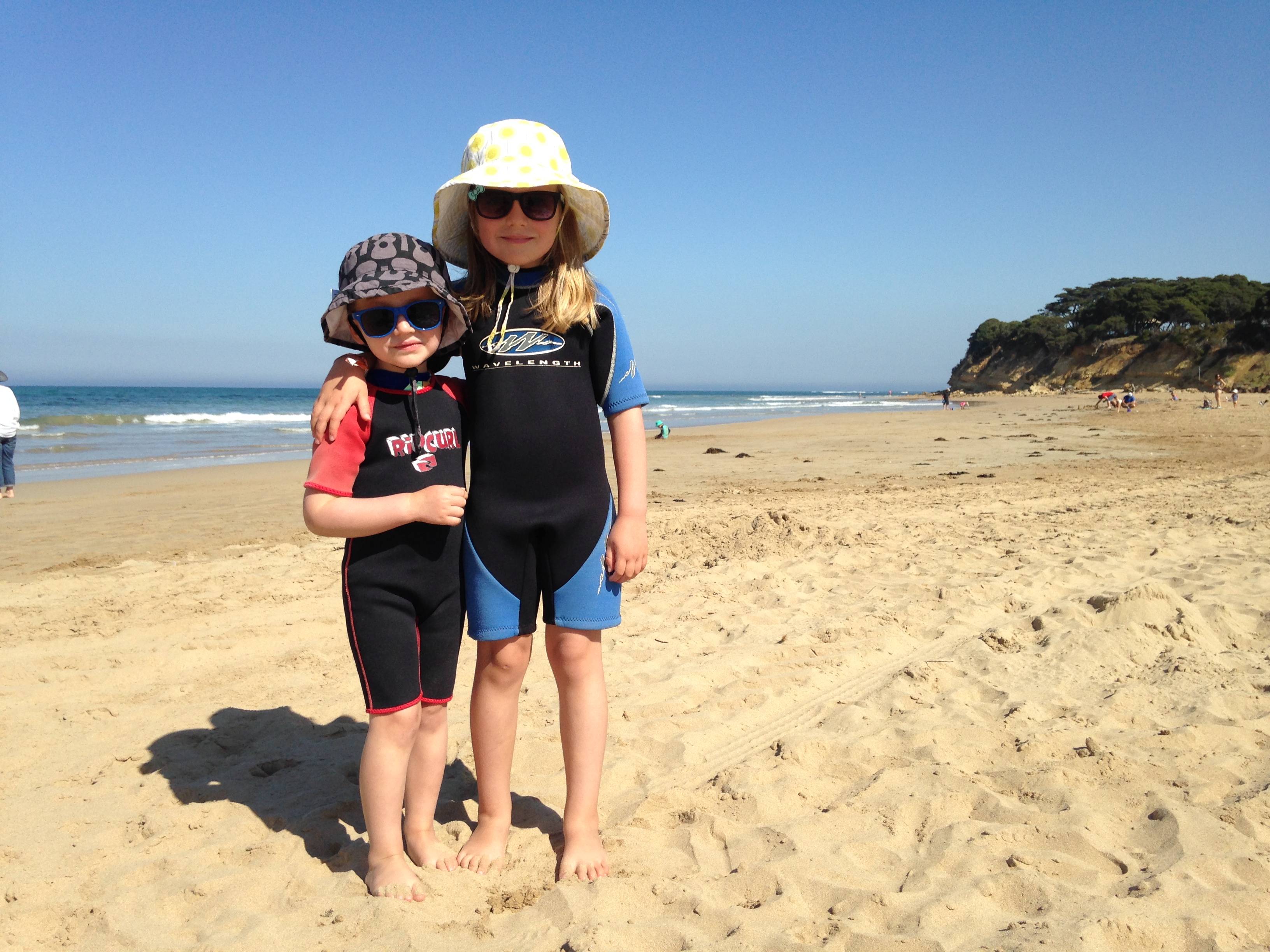 Other ‘Aussie kid’ activities include jumping the waves while wearing a wetsuit…at least in Torquay wetsuits are necessary due to the icy cold water. It took a few visits to the beach, but both kids are getting much more comfortable in the ocean…as long as it is only knee deep! We have also spend much time perfecting our sand castle building skills as well as writing huge letters in the sand and watching them disappear as the waves wash up on shore.
